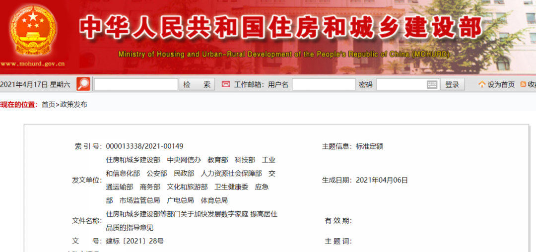 4月16日消息,住建部等16部委联合发布《住房和城乡建设部等部门关于加快发展数字家庭 提高居住品质的指导意见》(建标〔2021〕28号,以下简称“28号文”),正式吹响了家庭数字化发展的号角。