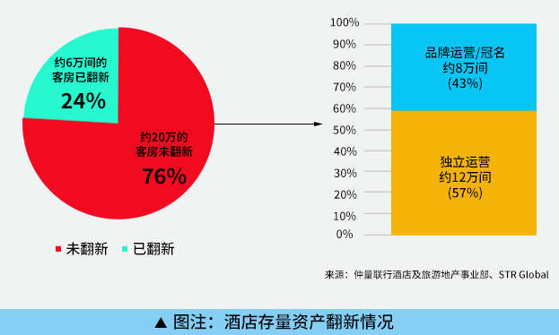 通过测算(见图上),这些酒店中尚未进行改造的客房为76%,约20万间,其中12万间为独立运营,具有重新定位的需求。酒店存量资产不断沉淀,部分酒店因硬件设施老化,经营成本逐年增加,还有部分酒店因为是单体酒店,势单力薄,市场不断被挤压,业绩下滑变成酒店存量资产。这些存量酒店或许困境不一而足,但投资人的核心诉求却是一致:突围当下的运营困境,实现盈利。如何盘活酒店存量资产,实现高效运营,促使困境中的酒店生意逐步走向复苏?并且面对同质化的产品及陈旧的设施,如何改造才能重新赢得市场?中国酒店业已经开始进入存量时代,酒店业需要重视存量资产的改造翻新。因此,旧酒店改造与产品转型被提上日程。