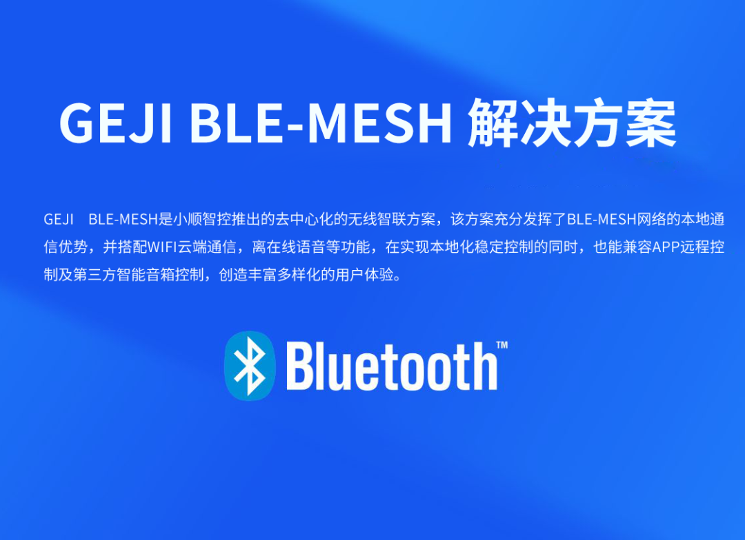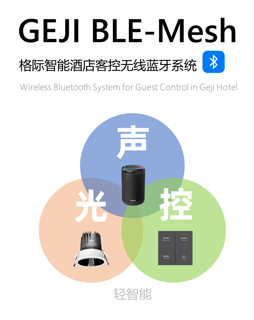 GEJI BLE-MESH 从体验上来讲,主要分声/光/控三部份产品系统,这三部份完成了酒店客房智能客控系统的使用和智能灯光场景的应用。