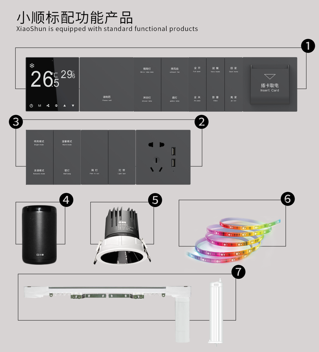 智能灯光场景:明亮模式/温馨模式/浪漫模式(可选)/睡眠模式/起床模式等等智能灯光场景可自定义,有些模式专为主题酒店和民宿提供,例如浪漫模式。客人通过语音控制或一键操作,就能启动设置好的灯光模式,小顺的智能灯光照明与别的厂家不同的是,除了能切换冷色和暖色(Cold & Warm),幻彩七色(RGB),还能精准地调亮度百分比(0%-100%),达到无极调光效果。